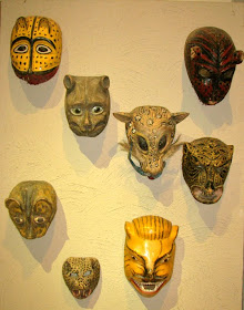 Some masks reflect the wild animals found in the indigenous makers' environment. Above you can see representations of various members of the cat family, including jaguars. In some indigenous communities, the animals were considered protectors. When the masks were worn during ceremonies, the wearer would dance in imitation of the movements of the animal represented.