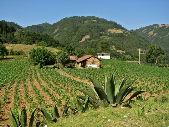 A typical mountain farm. In the foreground, spiky maguey grows as a boundary to the field. Maguey has been used for thousands of years by indigenous people. The fibres from its leaves can be used to make cord, weave baskets, and is sometimes used to embroider leather in a technique called piteado. The juice of its heart can be fermented to produce pulque, a mildly alcoholic drink popular throughout rural Mexico. Pulque is very ancient in Mesoamerica. At one time its use was considered sacred, and was restricted to the elite. Behind the screen of maguey plants grow rows of newly planted corn, another plant with Mesoamerican roots going back at least 7000 years. In the distance, the campesino's cottage is shaded by what appear to be fruit trees. We saw no farm machinery, so the fields were probably plowed using horses. This farmer was lucky enough to possess a relatively level piece of property. Many cultivated patches extended up hills so steep that, even as a regular mountain hiker, I could barely imagine climbing them. Yet, I saw men and women with hoes cultivating them by hand.