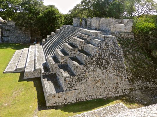 View of the north side of the pyramid. Extending from the left side of the base of the staircase is one of the odd concave buttresses. There is a similar buttress on the right side of the stairs. These Puuc/Chontal features were added during the Terminal Classic period (900-1100 AD). Their purpose is not clear.