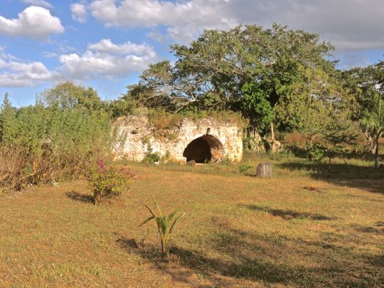 The circular stone structure may be the ruins of a noria. The stone wall is about 1.2m (4ft) tall and circles an area about 15m (50ft) across. Above the wall, you can see a stone structure in the center. I was mystified by the stone circle when I photographed it. Then, I researched the noria (waterwheel) ruins at Convento de San Bernardino de Siena, I now believe that these are the ruins of Ex-Convento de Kikil's noria. Above-ground water is scarce in northern Yucatan, except beneath the limestone surface. A cenote (sinkhole filled with water) is in the general area, but not close to the Ex-Convento. A well was needed.